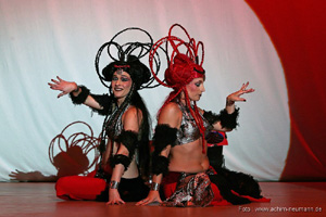Die schwarz- roten Schlangenhaut- Kostüme und die schwarzen Flügel lassen die Tänzerinnen des Tribes als wahrlich schwarze Engel erscheinen...